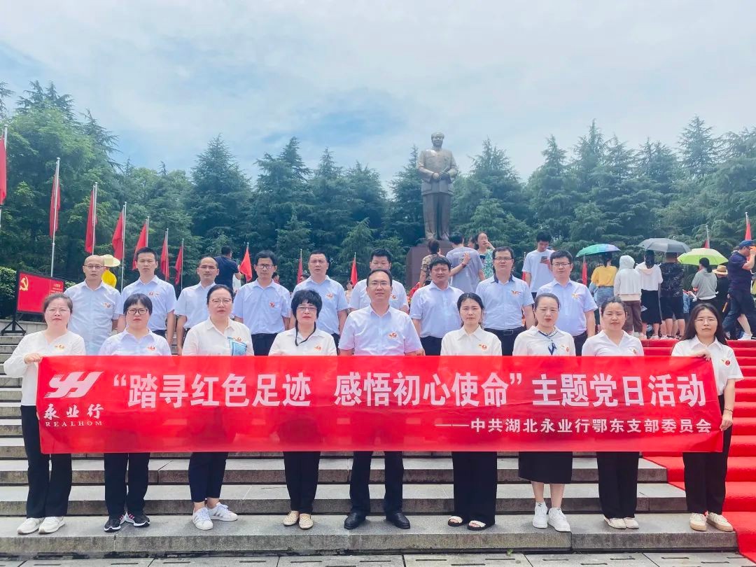 鄂东党支部开展“踏寻红色足迹,感悟初心使命”主题党日活动 2023-06-12 为庆祝中国共产党成立102周年,6月10-11日,中共湖北永业行鄂东党支部(下称“鄂东党支部”)组织全体党员、入党积极分子、管理团队等近20人赴湖南长沙、韶山开展“踏寻红色足迹,感悟初心使命”主题党日活动,通过缅怀伟人、重温入党誓词、参观纪念馆等形式,传承红色文化基因和革命精神,进一步坚定理想信念。 怀着对伟大领袖的无限敬仰和深切怀念之情,在永业行助理总裁、鄂东区总经理徐宇初的带领下,一行人到毛主席铜像广场,敬献花篮,鞠躬致敬。随后缓步绕行铜像一周,瞻仰伟人风范,缅怀领袖为人民谋幸福,为民族谋复兴的光辉一生。在伟人铜像下,由鄂东党支部书记魏晓红带领,全体党员庄严地 MORE